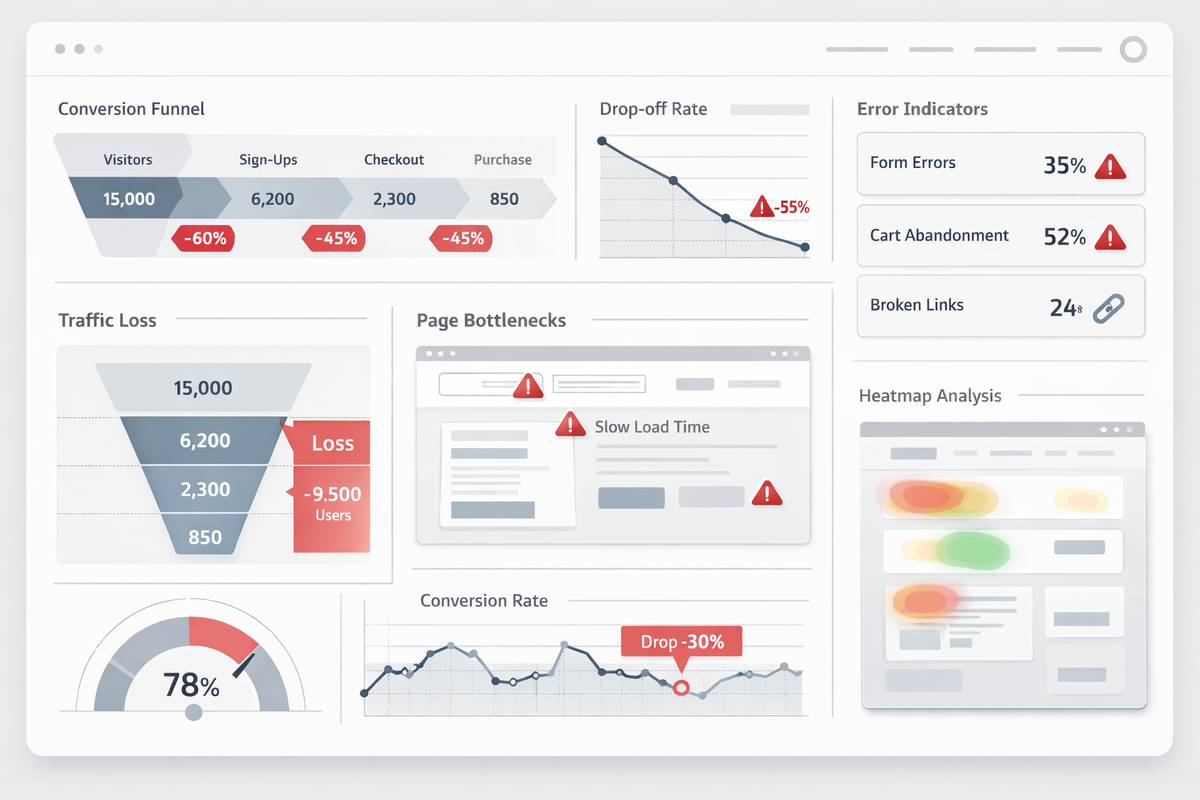 Каждый владелец бизнеса сталкивался с парадоксальной ситуацией: трафик на сайт есть, но заявок и продаж почти нет. Казалось бы, вложились в рекламу, посетители приходят, а конверсии не растут. Причина чаще всего кроется в недоработках сайта, неэффективной воронке или потере внимания потенциального клиента на ключевых этапах. Решение — комплексный аудит сайта, который выявляет узкие места и точки потери клиентов. Посетитель заходит на сайт, видит лендинг, но не находит то, что искал, или интерфейс не внушает доверия. Типичные ошибки: Даже миллионы показов рекламы не спасут конверсии, если посадочная страница не работает на цель. Часто бизнес «видит» только трафик, но не понимает, где теряются пользователи. Без детального анализа: Аудит позволяет выявить проблемные зоны и расставить приоритеты для исправлений. Пользователи быстро уходят, если сайт: Каждый такой «срыв» — потерянная заявка, и вместе они превращают поток трафика в пустые клики. Комплексный аудит, который реально влияет на р