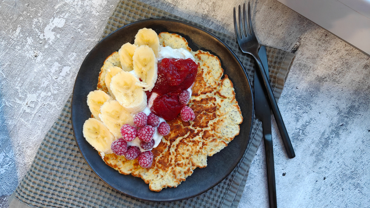 - Кокосовая лепёшка с семенами чиа + топпинг: сметана, джем без сахара из клубники и земляники, банан и малина.