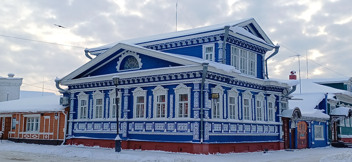 На пересечении улиц Рублева и Набережной Революции стоит пожалуй самый красивый деревянный особняк Городца, в котором находится музей "Терем русского самовара".
