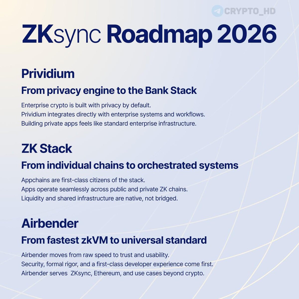 📍 В ZKsync опубликовали дорожную карту на 2026 год – смотреть Основные цели: вывести ZKsync за рамки L2 и DeFi, сделать ZK-инфраструктуру базовым слоем для банковских систем. Ключевые направления: • Prividium – приватные транзакции по умолчанию и удобное подключение к корпоративным и банковским системам. • ZK Stack – объединение разных ZK-сетей в единую систему, где приложения и ликвидность работают без мостов. • Airbender – развитие zkVM от гонки за скоростью к надежному универсальному стандарту с фокусом на безопасность и комфорт для разработчиков. Crypto Headlines