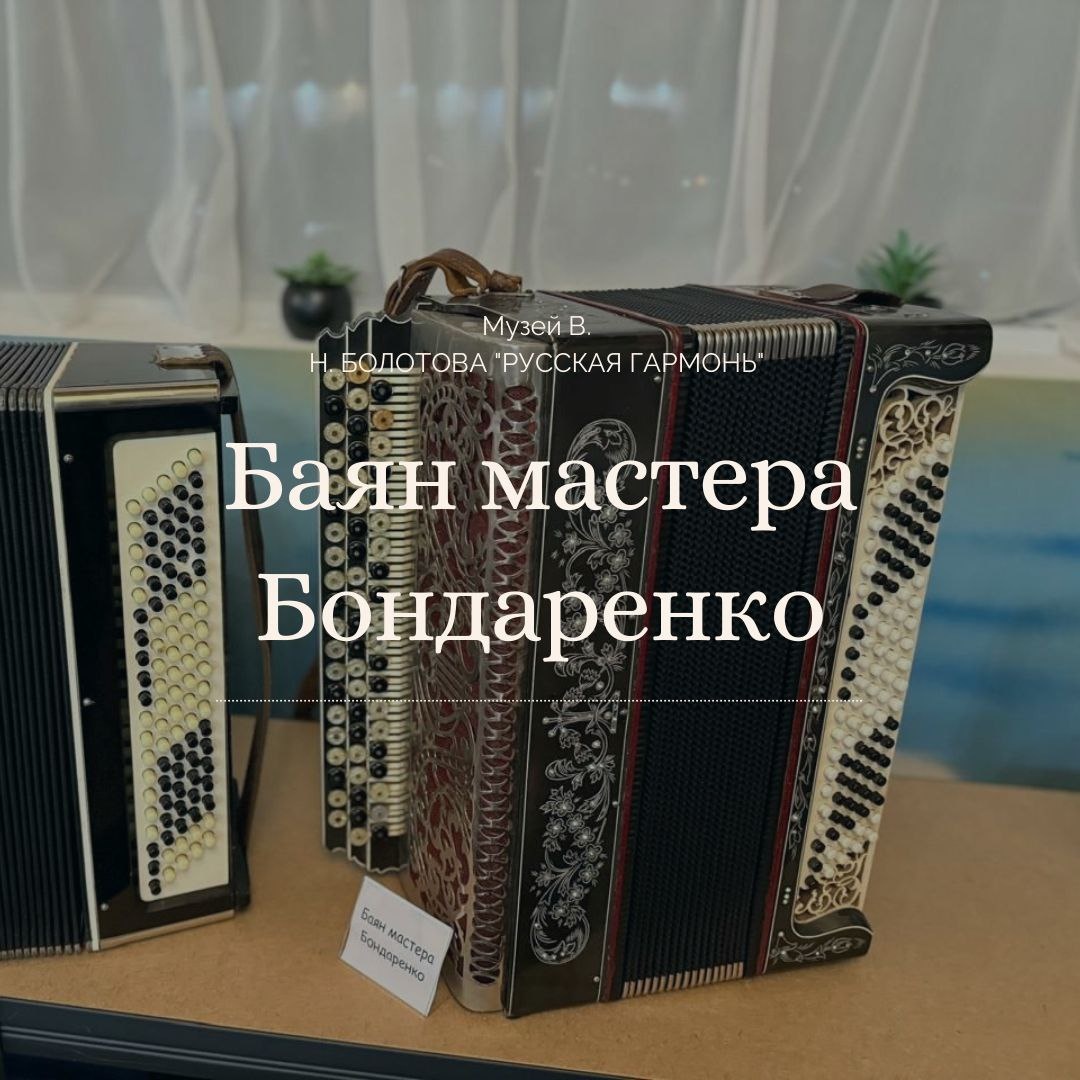 Н. Болотова — баян мастера Бондаренко В.Т., одного из старейших и талантливых мастеров из Таганрога! Этот баян — настоящее произведение искусства. Бондаренко изготовил множество инструментов. Они отличаются уникальным художественным оформлением, а характерной особенностью его инструментов является наличие розлива, похожего на тот, что встречается на аккордеонах. Наш баян особенно ценен благодаря наличию двух передвижных регистров за грифом, которые позволяют извлекать четыре разных тембра, что делает его универсальным и выразительным инструментом. В басовой части есть еще один регистр: он может изменять звучание — делая бас приглушенным или, наоборот, более глубоким и насыщенным. Приходите в музей — и вы сможете лучше узнать не только о этом уникальном инструменте, а также услышать звучание разных наших экспонатов и ближе приблизиться к нашей русской музыкальной истории! #МузейБолотова #Баян #Искусство #Мастерство