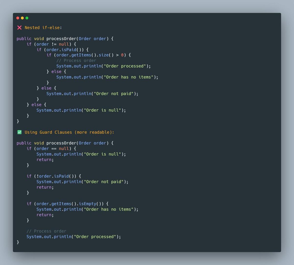 Одна из самых частых проблем в Java-коде глубоко вложенные условия. Код формально работает, но читать и поддерживать его тяжело. ❌ Плохо: вложенные if-else - сложно читать - логика размазана - любая правка превращается в боль ✅ Хорошо: guard clauses (ранние выходы) - проверки сразу отсекают невалидные состояния - основной сценарий читается сверху вниз - код короче и понятнее Почему guard clauses — это профессиональный подход: - уменьшают когнитивную нагрузку - делают бизнес-логику очевидной - упрощают рефакторинг и тестирование - отлично сочетаются с fail-fast философией Правило простое: если условие — это ошибка или исключение из нормального потока, проверь его сразу и выйди из метода. Так код становится: - линейным - предсказуемым - удобным для поддержки Мелочь на уровне синтаксиса, но огромная разница на уровне качества кода. Теги: java, clean code, best practices, backend, javadev