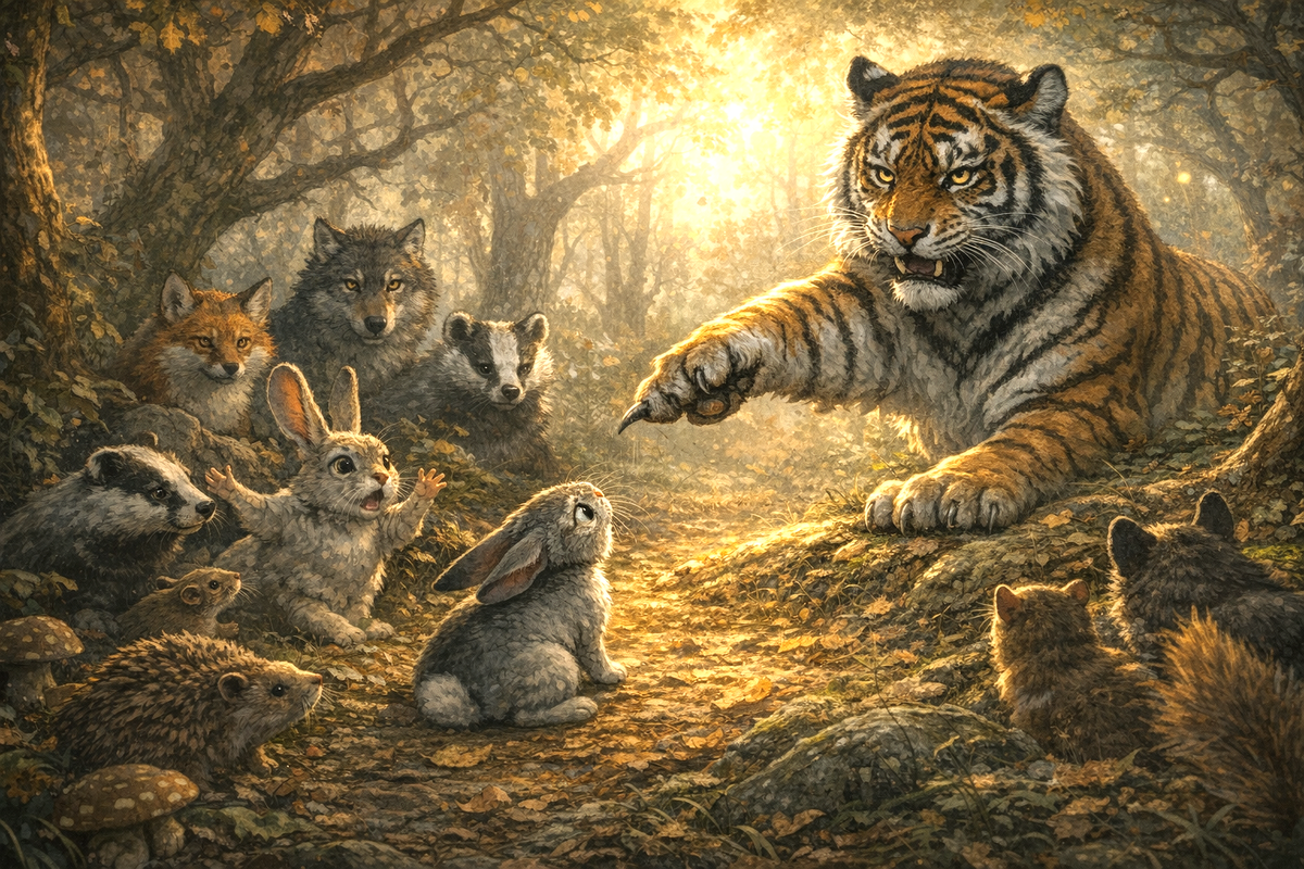 – Я знаю, что Заяц у нас многодетный отец, – произнёс Тигр медленно, растягивая слова, и в его низком, рокочущем голосе зазвучала неумолимая, железная логика. – И именно потому, если вдруг что несчастное с ним приключится, то содержание его большого семейства мы всем лесным обществом, скинувшись по справедливости, возьмём на себя. Так что твои многочисленные детки, Зайчиха, с голоду точно не помрут. Будет им и пища, и защита. Теперь все спокойны?
