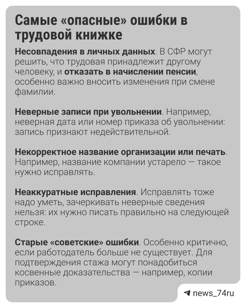 По словам заслуженного юриста России Ивана Соловьева, такие ошибки — это не просто опечатки, а реальная угроза будущей пенсии. В Социальном фонде из-за них могут не засчитывать определенный рабочий период в общий трудовой стаж. Что чаще всего встречается в трудовых и как избавляться от неточностей — читайте в карточках ответы юриста ⬆️