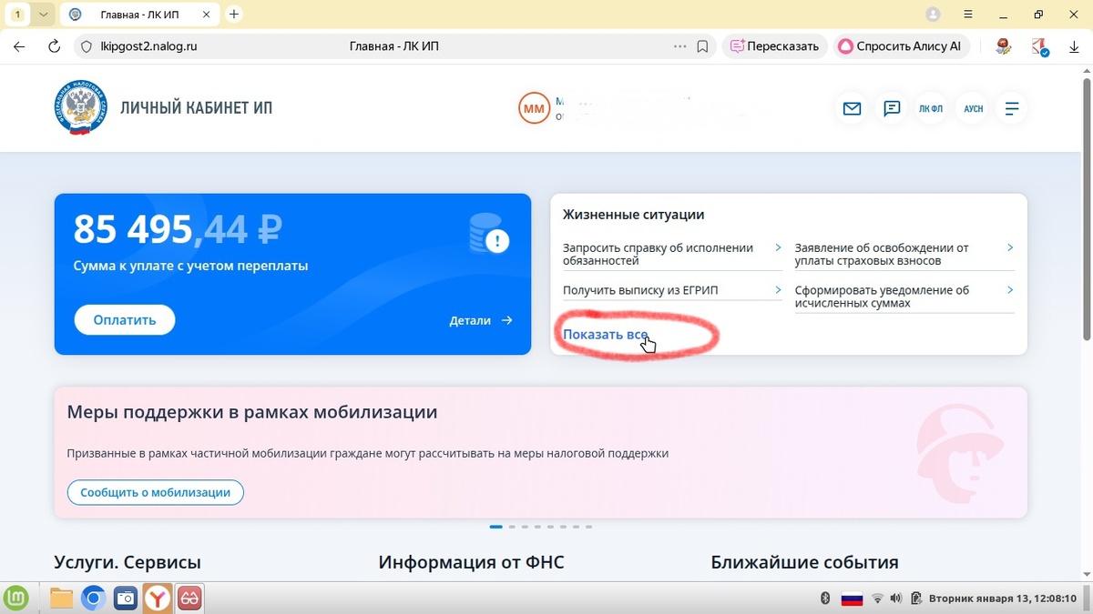 Захожу в личный кабинет ФСН для ИП с помощью ЭЦП. Раздел "Жизненные ситуации" --> "Показать все".