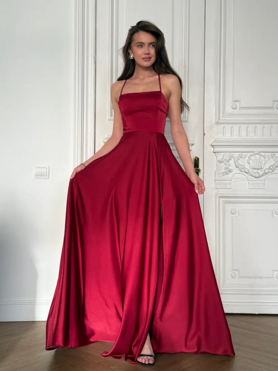 Атлас дает мягкий блеск, уместный для торжеств. Открытая спина и разрез добавляют образу откровенности, но в рамках классического вечернего стиля. Такое платье требует точной посадки по фигуре.