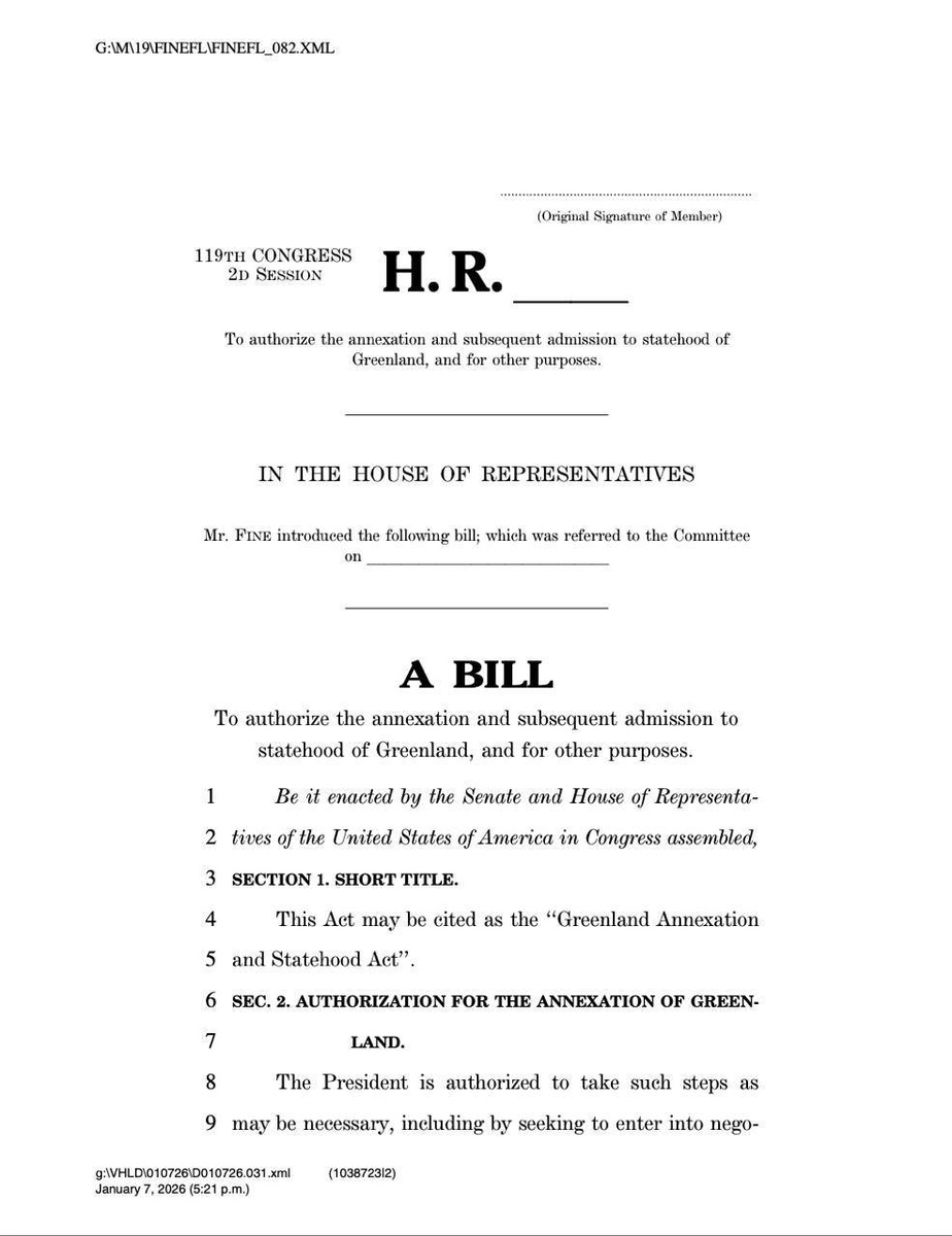 » В американский Конгресс официально внесён законопроект, который предусматривает аннексию Гренландии и предоставление ей статуса штата США. Документ уже опубликован на сайте Палаты представителей Пока это лишь законодательная инициатива без реальных шансов на быстрое принятие, но сам факт появления такого проекта уже вызвал резонанс — и в США, и за их пределами Шарья – столица мира Крупнейшее городское СМИ Источник: Открыть