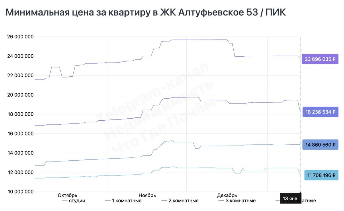 Новая волна коррекции цен у застройщика Сегодня в нескольких проектах ПИК снизил цены на квартиры на 5-10%. Местами немного упали минимальные ценники — смотрите на графиках ниже. Прошлую волну снижения цен мы фиксировали в декабре 2025. Еще больше новостей, аналитики и разборов рынка недвижимости — в нашем канале «Недвижимость | Что Где Почём» (в Telegram и Max). Подписывайтесь!