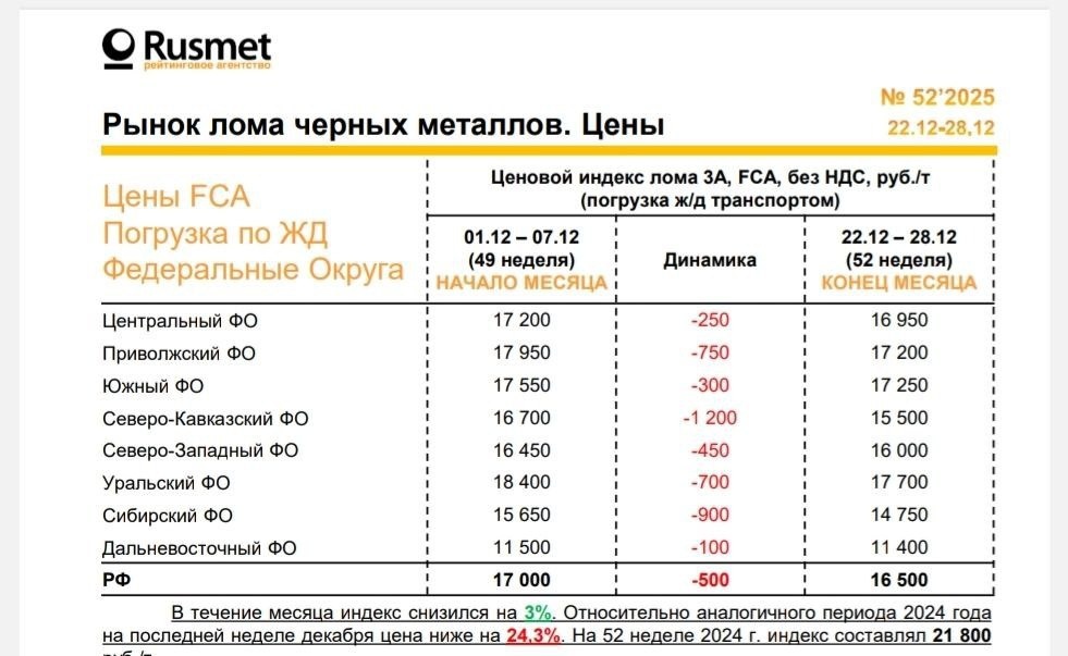 округах. Лидерами по падению стали Северо-Кавказский ФО (-1200 руб за тонну, а именно 16700 руб/т в начале месяца и 15500 руб/т в конце декабря) и Сибирский ФО (-900 руб за тонну, 15650 руб/т в начале и 14750 руб/т в конце декабря 2025 ). В среднем индекс цен за декабрь 2025 года упал на 3%, а по сравнению с последней неделей декабря 2024 года он ниже на 24,3% (тогда средневзвешенный индекс цена на лом черных металлов марки 3А составлял 21800 руб/т) Источник @ProRusLom — самое большое сообщество ломовиков в России @Metallolomprice_bot — укажи свои цены лом и узнай цены на лом по всей стране