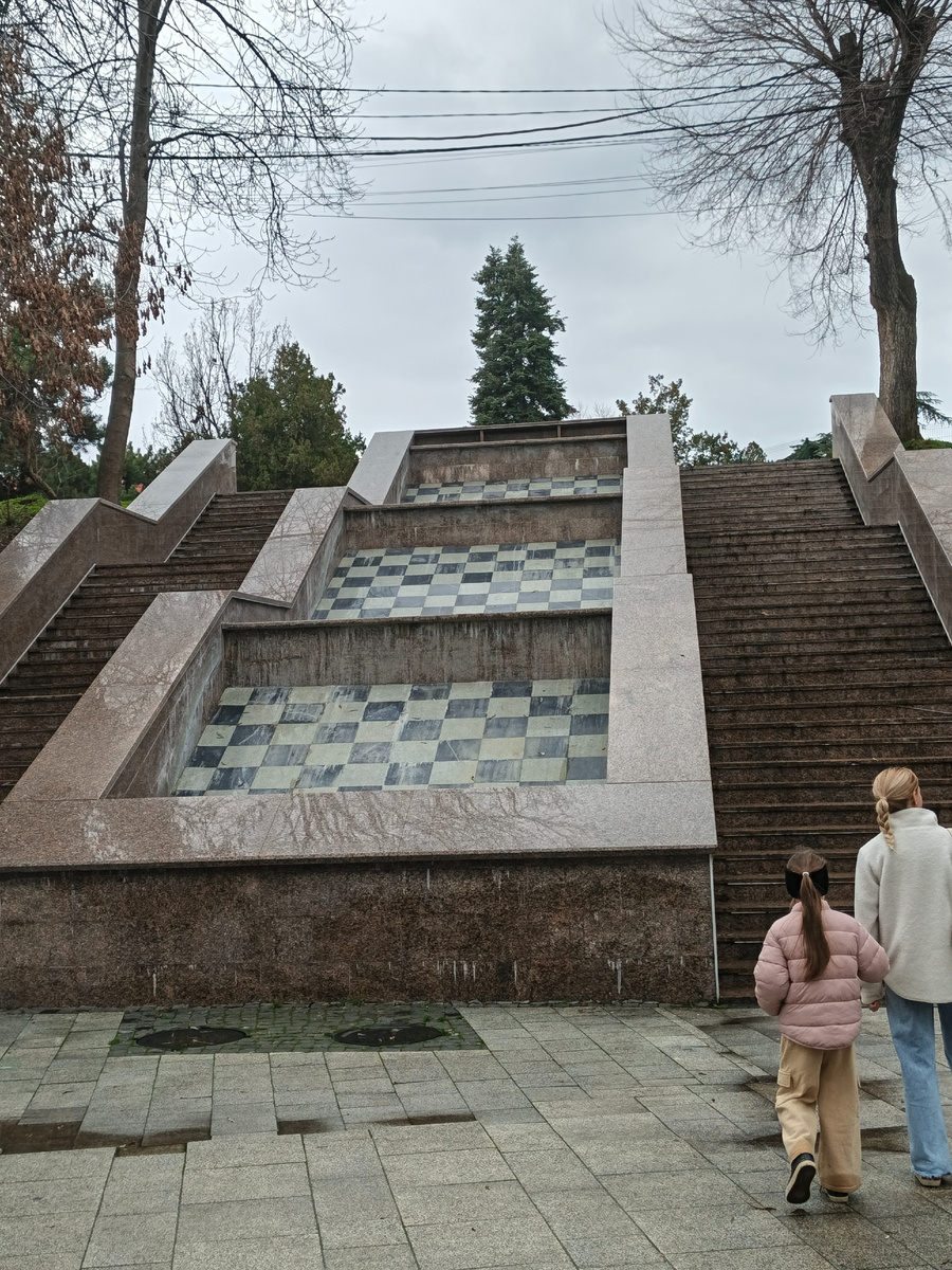 Начало: Поднимаемся по шахматной лестнице, попадаем на шахматную скульптуру Пешка. По идее к пчелкам нужно идти прямо и левее, к памятнику Екатерине 2. но мы идем направо. Мимо шахматных столов и видим заброшенный летний кинотеатр. Какое же красивое здание! Мы проходим арку, выходим на проспект Кирова-ул. Ленина. Тут идет круг....Просто я хотела посмотреть кинотеатр спереди. С главного входа. К слову, потом мы мимо будем ездить несколько раз)) Это все центральные улицы. Листайте. Возвращаемся...Проходим арку и идем вдоль дороги по аллее к памятнику Екатерины 2. На лавочке здороваемся с пчелкой шахматистом. Не доходя на площадки с памятником, на клумбе, со стороны дороги видим пчелку туриста, который что-то фотографирует. И вот мы видим памятник Екатерине 2. На этой площадке по кругу идет что-то вроде скамеек и бассейна-фонтана.))) И вот первую на бетонном сооружении видим остаток от пчелки...На карте она указана просто как пчела. А на сайте пчелок, она обозначена как пчелка богиня крас