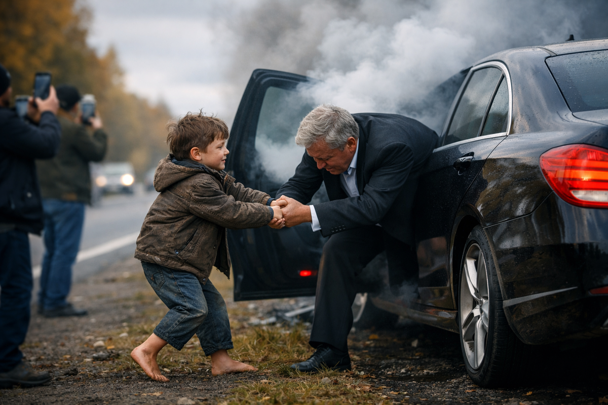 Пламя било из-под капота чёрного «Мерседеса» так, что казалось буквально — ещё мгновение, и машина взорвётся прямо на глазах у толпы зевак, собравшихся на обочине Можайского шоссе. Люди стояли кружком, снимали на телефоны, кто-то уже успел выложить видео с подписью «Богачи горят красиво». Но никто не приближался: жар обжигал лицо, дым щипал глаза, а из салона доносились слабые стоны. И только маленький мальчик в потёртой куртке, босой, несмотря на октябрьскую слякоть, вдруг рванул вперёд. Он протиснулся сквозь серый дым, дёрнул заднюю дверцу — та поддалась. Мальчик закашлялся, но всё равно вцепился обеими руками в рукав седого мужчины в дорогом костюме и начал тянуть его из салона. «Эй, пацан, отойди, рванёт!» — крикнул кто-то, но ребёнок не слушал. Он тянул, упираясь коленями в мокрый асфальт, пока тяжёлое тело не вывалилось наружу. Тимоша тащил его, пока руки не свело от напряжения. Мужчина был тяжёлый, безвольный, словно мешок с песком. Тимоша не понимал, кто он и сколько стоит его костюм, — он видел только человека, которому плохо. Когда они отползли в сторону, огонь взметнулся выше, и кто-то из толпы наконец вызвал скорую. Уже потом, когда сирены заглушили треск пламени, взрослые начали суетиться, делать вид, что «помогали», но мальчик сидел на обочине, дрожал от холода и копоти и молча смотрел на горящую машину, словно боялся, что его труд окажется напрасным.