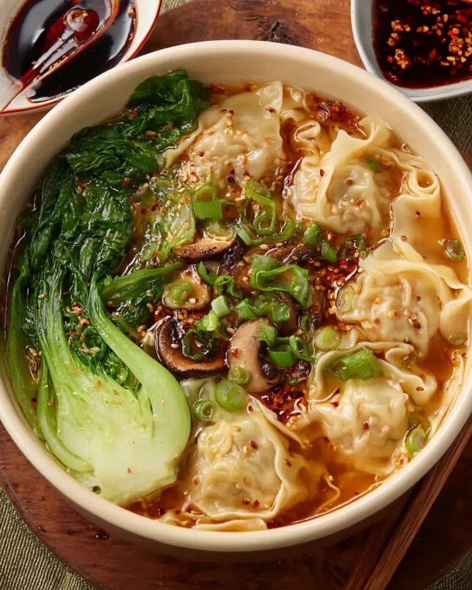 Это не просто суп с пельменями, а сложное блюдо, где пельмени (часто вонтоны) плавают в ароматном, тёмном, пряном бульоне, а свежая зелень (чаще всего не салат, а кинза, зеленый лук и иногда пак-чой) добавляется в конце для свежести.