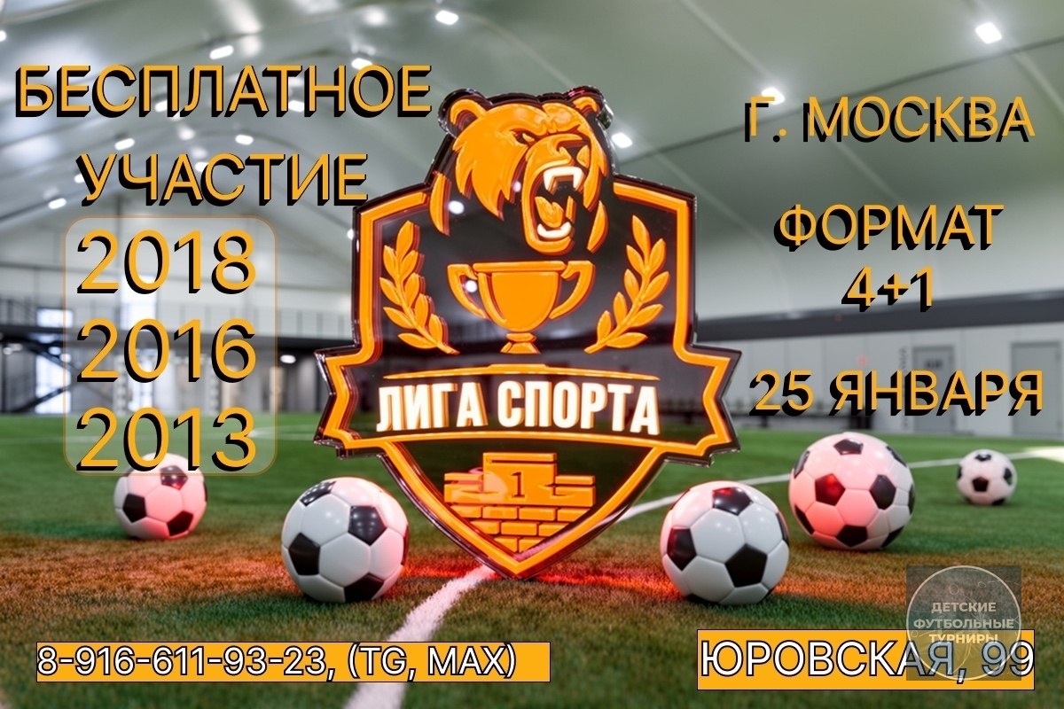 » (https://vk.com/club234173848) Приглашаем команды принять участие в бесплатном турнире по футболу ⚽ Формат 4+1 Среди команд 2013, 2016 и 2018 г.р 📍г. Москва, Юровская 99 Можно добраться от метро Планерная и МЦД Химки 📆25 января 2018 г.р (с 9:00 до 11:30) 2016 г.р (с 12:00 до 14:30) 2013 г.р (с 15:00 до 17:30) 🏟 Современный манеж с качественным искусственным газоном 💯 профессиональное судейство 📷 профессиональная фотосъемка на играх и награждении 🎁🏆кубки, медали и призы лучшим игрокам в каждой команде 🗣Места для зрителей 🎤 музыкальное сопровождение ✅ Успей оставить свою заявку, так как количество мест ограничено - 8-916-611-93-23 (MAX, TG) --- #ФутбольныйТурнирЯнварь2026 #ФутбольныйТурнирМосква2026 #ФутбольныйТурнирМосква2018гр #ФутбольныйТурнирМосква2016гр #ФутбольныйТурнирМосква2013гр Источник: https://vk.com/wall-178222694_2509