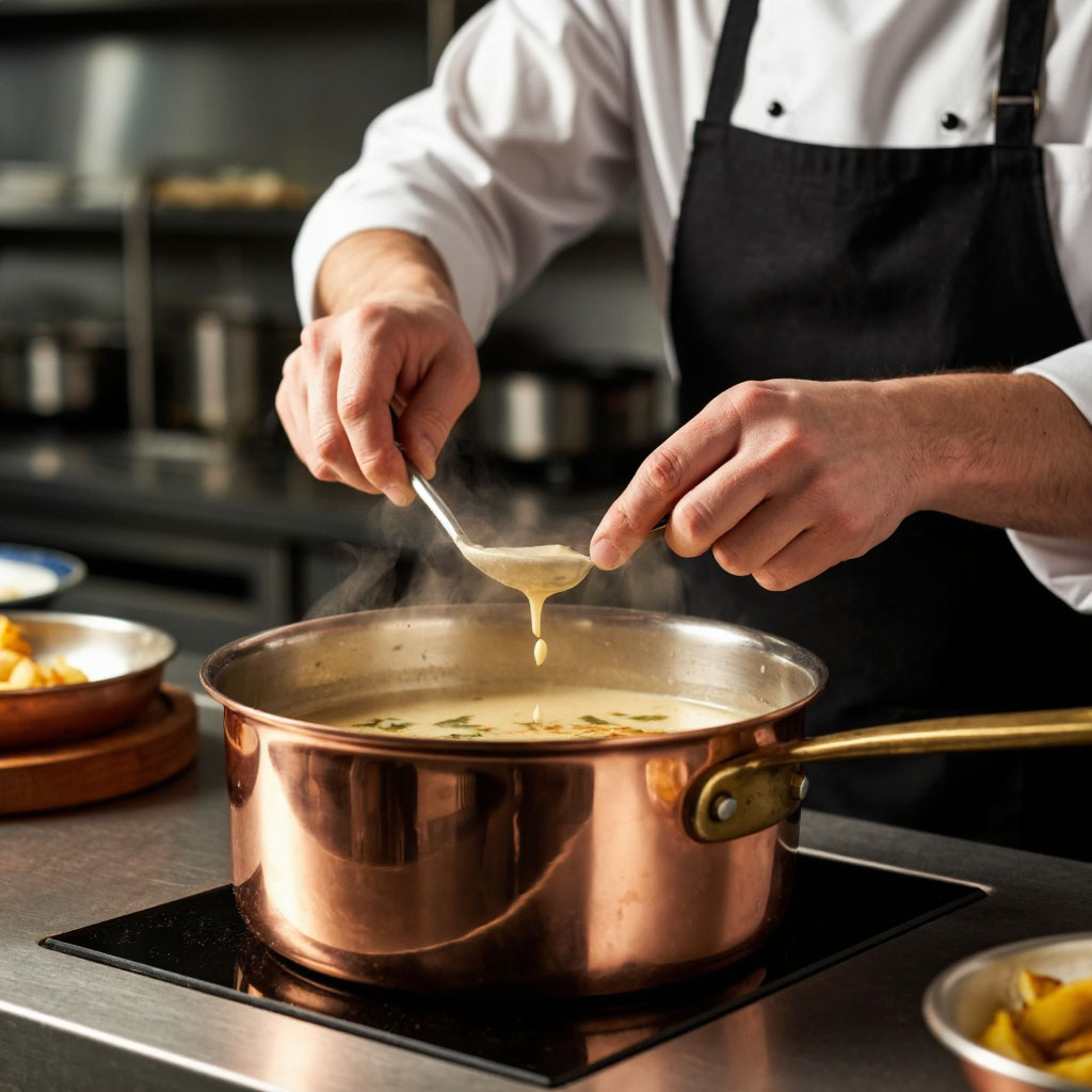 Его нарезают мелким, ровным кубиком. В соусе он не должен ощущаться с текстурой - только вкус. В сотейнике растапливают половину масла и прогревают лук до прозрачности, без малейшего зажаривания.