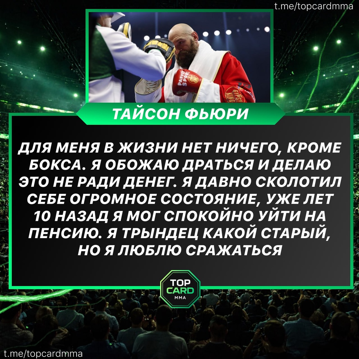 У меня нет никаких других интересов. Я был рожден и выращен для боев. В конце своего пути я буду изрядно потрепан и, скорее всего, окажусь в инвалидном кресле. Я буду путать дни недели, не буду понимать, какой месяц на дворе, но… Я сам выбрал такой путь TOP Card
