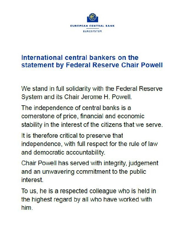 ЕЦБ и другие европейские и международные центральные банки полностью солидарны с Федеральной резервной системой и ее председателем Джеромом Пауэллом Независимость центральных банков отвечает интересам людей, которым мы служим В списке, кстати, главы ЦБ Ю.Кореи и Бразилии @marketheart