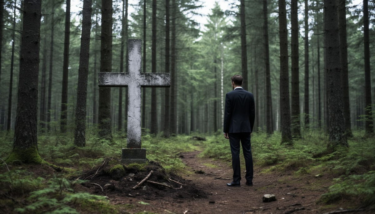 Он подходит ближе. Деревянный, покосившийся крест воткнутый в землю. Древесина серая, изъеденная временем, никаких надписей, никаких дат. Только глубокие трещины.