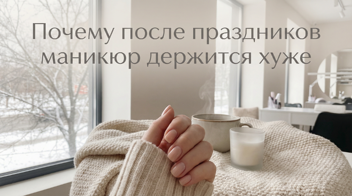 Многие мастера замечают одну и ту же картину в январе: маникюр, который обычно носится 2–3 недели, начинает скалываться быстрее, появляются отслойки, а клиенты жалуются, что «раньше держалось лучше». И это не совпадение. После праздников меняется сразу несколько факторов, которые напрямую влияют на носку гель-лака. Праздники — это: Всё это отражается на состоянии кожи и ногтей. Ногтевая пластина становится суше или, наоборот, нестабильнее — и сцепление с материалом ухудшается. Когда ногтю не хватает влаги или он травмирован, материалу сложнее «зацепиться» за поверхность. Даже при правильной технике покрытие может начать вести себя нестабильно. Отсюда — сколы и отслойки уже в первую неделю. После праздников многие активно: Резкие перепады температуры и агрессивная среда ускоряют износ покрытия, особенно если ногти уже ослаблены. Если в январе носка ухудшается сразу у многих клиентов, причина почти всегда системная. Материалы те же. Лампа та же. А вот состояние ногтей — другое. В такие