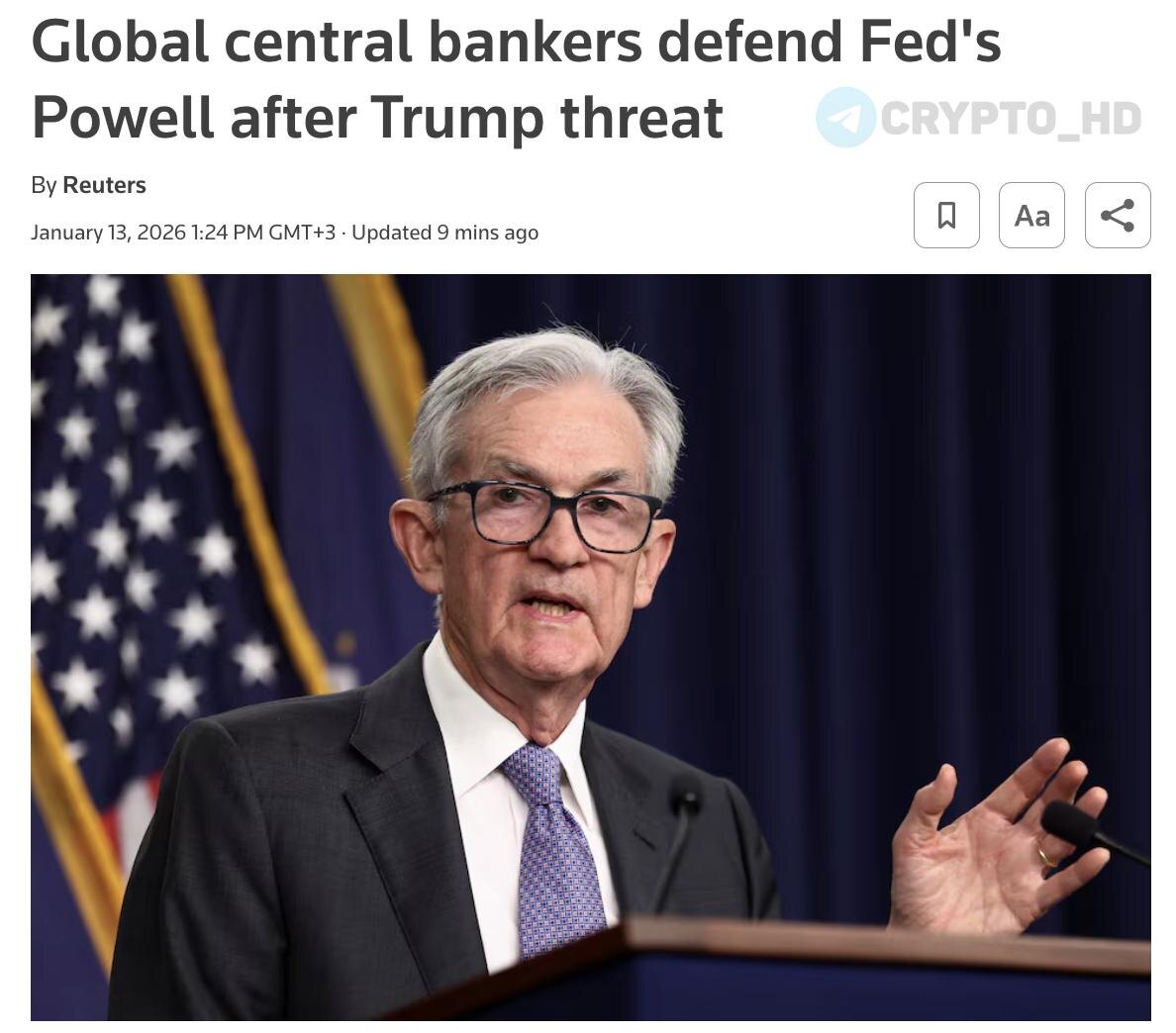 ) ➤ Главы 11 крупнейших центральных банков мира, включая ФРС США, ЕЦБ и Банк Англии, выпустили совместное заявление в поддержку главы ФРС Джерома Пауэлла. ➤ Ключевой посыл: Независимость центральных банков — фундамент ценовой, финансовой и экономической стабильности. ➤ Контекст: Администрация Трампа начала уголовное расследование в отношении главы ФРС Джерома Пауэлла. Ранее: экс-главы ФРС Crypto Headlines