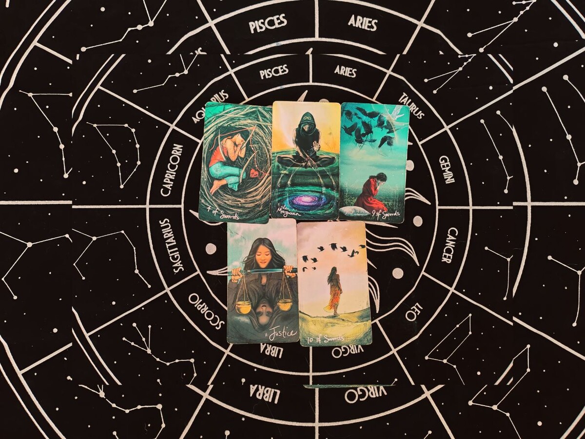 Это история о тяжелом размышлении после болезненного опыта (4 Мечей, 10 Мечей), попытке взять контроль над ситуацией (Маг), но его парализуют тревоги и чувство вины (9 Мечей), и он стремится к окончательному решению или справедливому итогу (Справедливость).