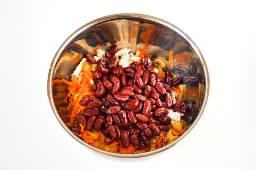 🥗 📖 Ингредиенты: · Куриная грудка — 300 г · Фасоль консервированная — 200 г (без жидкости) · Грибы маринованные — 200 г · Твёрдый сыр — 100 г · Лук репчатый — 1 шт. · Морковь — 1 шт. · Майонез — 50 г · Сметана (15%) — 50 г · Соль — по вкусу 🧑🍳 Приготовление: 1. Куриную грудку отварите до готовности, остудите и нарежьте брусочками. 2. Лук нарежьте кубиками, морковь натрите на крупной тёрке. Обжарьте овощи на сковороде 5-7 минут до мягкости. 3. Маринованные грибы нарежьте слайсами, сыр — небольшими брусочками. 4. В большую миску выложите курицу, охлаждённые обжаренные овощи, грибы, сыр и промытую фасоль. 5. Заправьте смесью майонеза и сметаны, аккуратно перемешайте. При подаче можно украсить зеленью. Полезные советы: · Для яркого вкуса используйте копчёную куриную грудку. · Свежие грибы можно обжарить отдельно 6-8 минут. · Заправляйте салат только после того, как все ингредиенты остынут. #салат #курица #фасоль #грибы #сытный #рецепт https://dzen.ru/id/5d30f5b3f2df2500ad9dda8