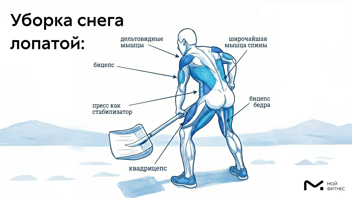 Уборка снега = функциональная тренировка Когда вы откидываете снег, работает почти всё тело: ✓Ноги и ягодицы — приседания, выпады, устойчивость на скользкой поверхности; ✓Кор (пресс и поясница) — стабилизация корпуса, удержание равновесия; ✓Спина и плечи — тяговые движения, перенос веса, развороты; ✓Руки и предплечья — хват, контроль лопаты, толчки и подъемы. По сути это микс из приседаний, становой тяги, «рывков» (только без грифа) и кардио, потому что пульс поднимается очень быстро — особенно когда снег мокрый. Почему это реально ощущается как кардио Снег — штука коварная: он создаёт сопротивление. И чем он тяжелее, тем сильнее вы включаете двигатель. Поэтому 15–2