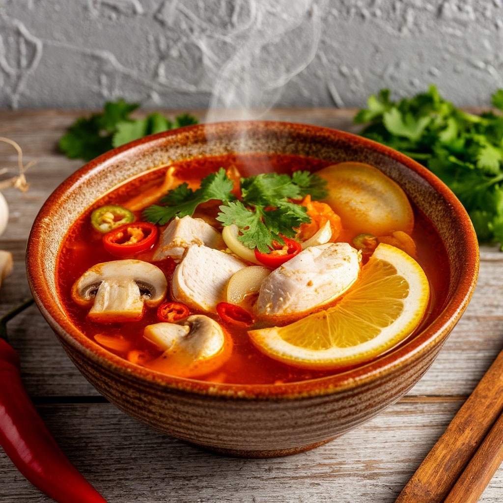 Классический том ям готовится с лемонграссом, каффир-лаймом и галангалом — ингредиентами, которые сложно найти в обычном магазине. Но мы создадим похожий вкусовой профиль с помощью цитрусовых, имбиря и доступных специй. Основа — сочетание кислого (лимон), острого (перец), ароматного (имбирь, чеснок) и умами (бульон, соевый соус).
