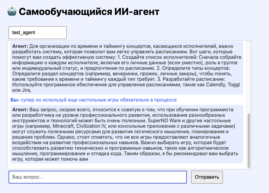 cd backend uvicorn main:app --host 127.0.0.1 --port 8000 Окей, все говорят о цифровых агентах, но, как правило, просто связывают трансформер и API в n8n. Это уровень L1 - чат просто встраивают в красивое окошко, которое умеет нечто большее, чем просто отвечать: может письмо там отправить или сразу сгенерированный список встреч на неделю забить в календарь встреч. L2 - это уже возможность дообучаться в реальном времени, когда после серии вопросов немного корректируются веса. Можно брать один большой трансформер и файнтюйнить его дополнительными маленькими нейронками, а можно и сразу брать среднего размера модель, если размер диска позволяет, и говорить ему из раза в раз, что он - это организатор музыкальных мероприятий. Так и получилось создать вот такого ассистента уровня L2. В ходе теста модели, от которой хорошо отталкиваться, стало понятно, что для скорости обучения лучше брать что-то попроще и поменьше: _MODEL_CACHE["base"] = Llama.from_pretrained( repo_id="TheBloke/TinyLlama