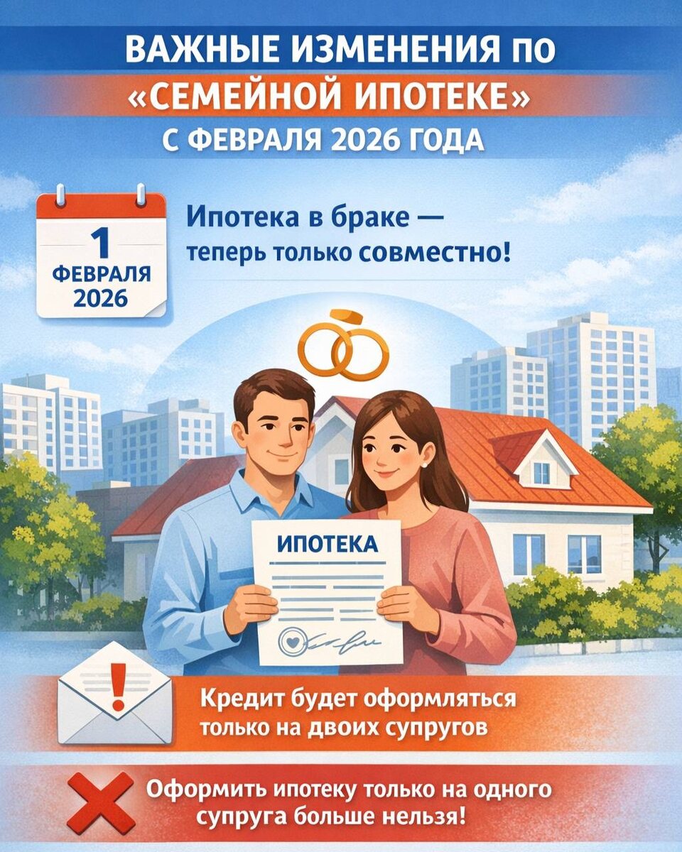 С 1 февраля 2026 года меняются правила участия в программе «Семейная ипотека». Изменения уже утверждены, и для многих семей они будут принципиальными. ✉️ Ключевой момент: нельзя будет взять вторую ипотеку, как мы раньше брали на одного супруга, теперь второй супруг теряет это право. Исключение — если супруг (или супруга) является иностранным гражданином. Как это будет работать на практике⬇️ Ситуация 1⃣ Вы в браке, ранее льготными ипотеками не пользовались. ▫️С февраля 2026 года «Семейная ипотека» оформляется только с обязательным включением второго супруга в договор. Ответственность по кредиту — общая. Ситуация 2⃣ У одного из супругов была льготная ипотека, оформленная до 23 декабря 2023 года. ▫️Новую «Семейную ипотеку» оформить можно, но снова — только при совместном участии супругов. Ситуация 3⃣ У одного из супругов есть льготная ипотека, оформленная после 23 декабря 2023 года. ▫️В этом случае с февраля 2026 года действуют более жёсткие условия: — в семье должен родиться реб