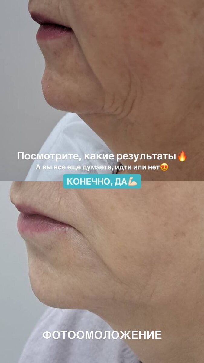 Фотоомоложение. Это идеальный пример того, как световые технологии работают не только с цветом кожи, но и с её текстурой, возвращая ей гладкость и здоровое сияние. Если вы всё ещё думаете, стоит ли идти — посмотрите на этот результат! Ответ очевиден: конечно, ДА! 🔥 ДО: ❌ Выраженная сеточка морщин в области подбородка и вокруг губ. ❌ Неровный микрорельеф кожи (эффект «апельсиновой корки» на подбородке). ❌ Тусклый цвет лица и наличие мелких пигментных пятен. ❌ Сниженный тонус и дряблость кожи в нижней трети лица. ПОСЛЕ: ✅ Заметное разглаживание морщин и заломов. ✅ Идеально гладкая, «отполированная» текстура кожи. ✅ Ровный, свежий и сияющий тон лица. ✅ Уплотнение кожи и мощный омолаживающий эффект за счет стимуляции собственного коллагена. Фотоомоложение — это процедура, которая буквально стирает следы времени, делая кожу плотной, упругой и чистой. 💎