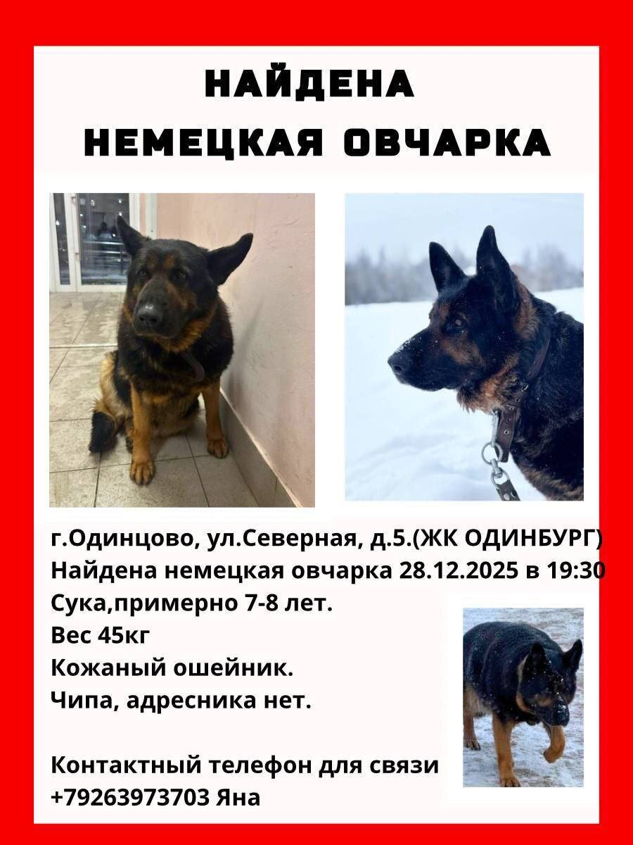 ! НАЙДЕНА НЕМЕЦКАЯ ОВЧАРКА г.Одинцово, ул. Северная, д.5.(ЖК ОДИНБУРГ) Найдена немецкая овчарка 28.12.2025 в 19:30 Сука,примерно 7-8 лет. Вес 45кг Кожаный ошейник. Чипа, адресника нет. Контактный телефон для связи +79263973703 Яна