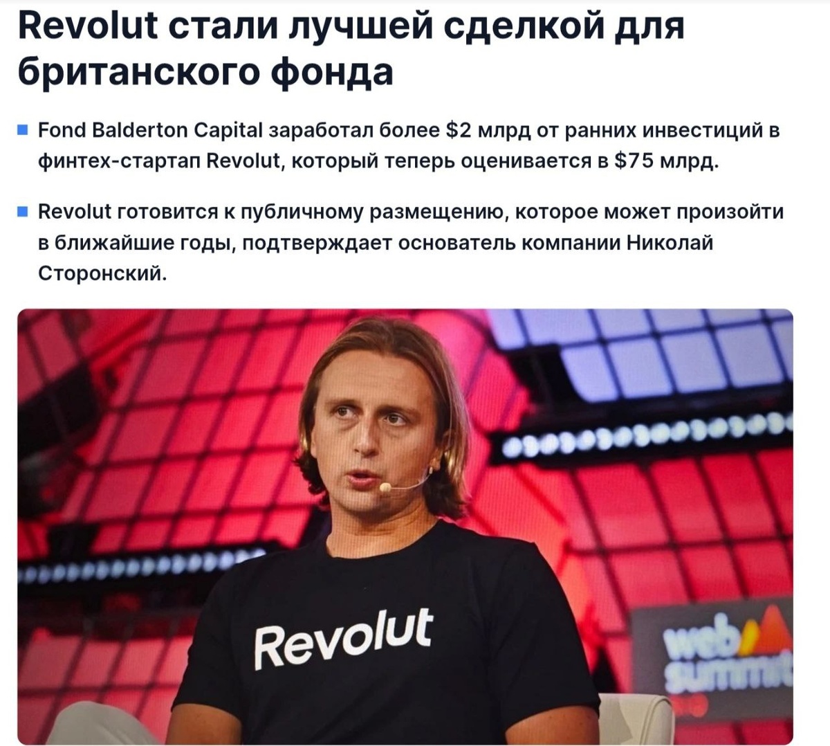 прибыльных вложений в истории европейского венчурного капитала, пишет Financial Times в статье «Миллиарды из миллиона: лондонский венчурный фонд, сорвавший джекпот с Revolut». Британский Balderton Capital, инвестирующий в технологические стартапы Европы, в 2015 году возглавил самый ранний инвестраунд Revolut. В том раунде стартап привлек £1,5 млн, из которых £1 млн дал Balderton, рассказали источники FT. С учетом привлеченного капитала Revolut тогда оценили в £6,7 млн. Основатель Revolut Николай Сторонский на старте смог убедить ранних инвесторов в масштабе своих амбиций и глубоком понимании инфраструктуры платежей, рассказал FT партнер Balderton Дэниел Уотерхаус, который ранее входил в совет директоров Revolut. По его словам, в презентации Сторонского не было «чепухи и показухи». «Это одна из причин, по которым он оказался столь успешным», — сказал партнер Balderton. Сейчас Revolut оценивают уже в $75 млрд. По словам собеседников FT, фонд Balderton Capital, в котором находится доля