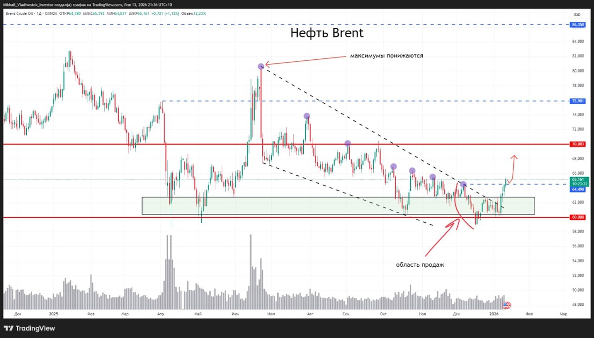 🥳 🛢 Нефть марки Brent превысила 65 долларов впервые за 2 месяца, — данные торгов Главный драйвер цен — опасения рынка, что США нанесут удар по Ирану на фоне проходящих там протестов. Brent $BRF6 Таймфрейм дневной Если смотреть по графику, то я выделяю тот факт, что пробили 64,49 - предыдущий максимум. А так же вышли из области продаж. Если закрепляемся, то можем спокойно пойти выше. Обратная фундаментальная сторона медали - это Венесуэла и давление США на котировки. 🧐 #нефть #brent