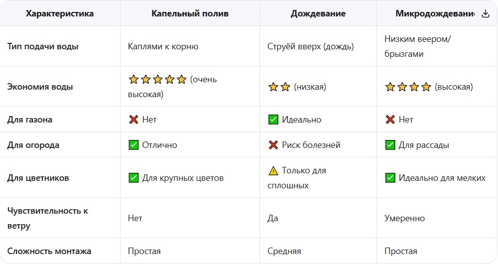 Как выбрать правильную систему автополива для вашего сада, газона или огорода? Вы решили автоматизировать полив — отлично! Но тут возникает новый вопрос: какой тип системы выбрать? В магазинах и на сайтах то и дело мелькают термины: капельный полив, дождевание, микродождевание. Звучит похоже, но работает совсем по-разному. Давайте разберёмся просто и наглядно: чем они отличаются, где каждый работает лучше всего — и какой вариант подойдёт именно вам. Вода подаётся медленно и точно — через маленькие отверстия (в капельнице/эмиттере) — прямо к основанию растения. Никаких брызг, никакого испарения. ✅ Экономит до 50–70% воды по сравнению с поливом шлангом