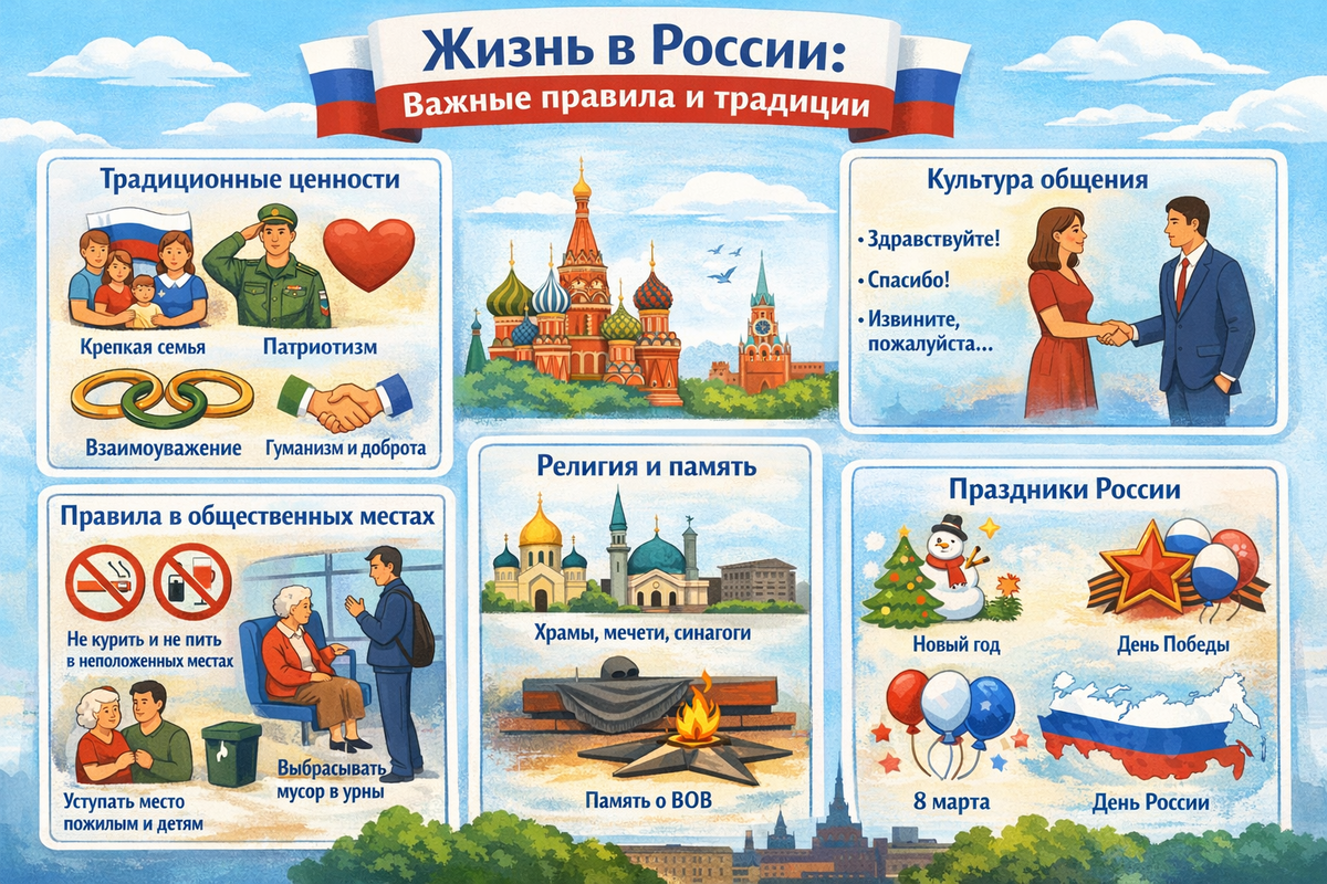 Россия — одна из крупнейших стран мира не только по территории, но и по культурному, этническому и религиозному многообразию. Здесь веками формировалось уникальное общественное пространство, в котором мирно сосуществуют сотни народов, говорящих на разных языках, исповедующих разные религии и сохраняющих собственные традиции. Именно поэтому в России особенно высоко ценятся уважение, сдержанность, следование законам и внимание к культурным нормам.
