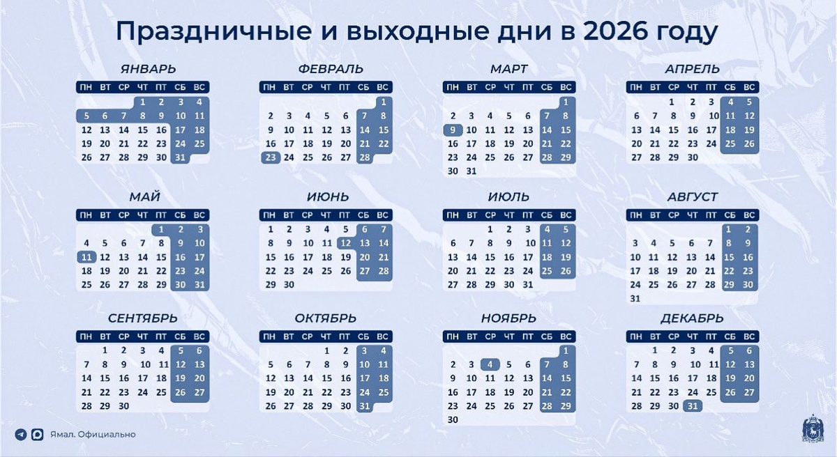 Дальше нас ждут сокращённые рабочие недели и дополнительные дни отдыха. По три выходных дня подряд будут в феврале, марте и июне. В мае на трёхдневную перезагрузку уйдём дважды – с 1 по 3 мая и с 9 по 11 мая. Сохраняйте календарь себе и делитесь с друзьями. 📲 ЯМАЛ. Официально | Подписывайтесь на нас в MAX