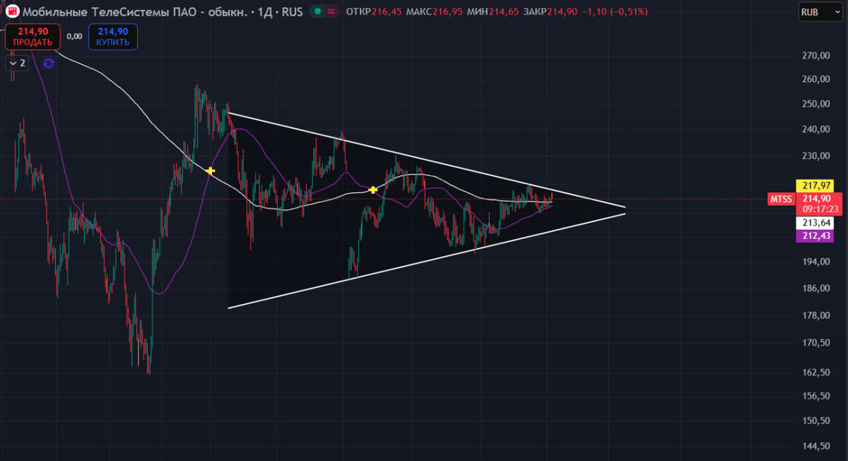 #MTSS #МТС Верхняя стенка треугольника 217,25, если пробьет и закрепится, то пойдёт отрабатывать треугольник наверх. Пока что есть шанс пойти к нижней стенке до 206 руб. 🔼 Отработка треугольника, если пробьет наверх примерно 262,5. Как только пробьет и закрепится пойдёт отрабатывать фигуру ровно до нижней стенки большого треугольника. В данный момент волатильность низкая, объемов в рынке мало. Не является инвестиционной рекомендацией 🔍 Канал в телеграм https://t.me/+wA71h-ynKKs0ZmRi
