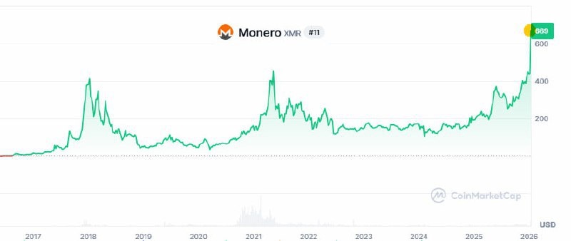 Monero (XMR) — топовый анонимный криптотокен — на старте января 2026 бьет рекорды. С 7 по 13 января цена взлетела с $441 до $636, это примерно +44% роста за неделю, с пиковым дневным ростом до 18% и недавним скачком в +17%. Усиление связано с ростом интереса к конфиденциальности и обновлением протокола (тестнет Quantum Resistance). Почему это важно: Резкий взлет XMR отражает тренд повышенного спроса на приватные криптоактивы на фоне регулирования и инфляционных рисков. Это сигнал для криптоинвесторов: растущий спрос поднимает ликвидность и заставляет смотреть в сторону анонимных токенов. Есть волатильность — риск коррекции не отменен, поэтому стоит подходить аккуратно: можно брать частичные позиции в долгую, но с четким стопом. Какая у тебя стратегия по XMR? Остаемся в лонге или ждем откат? #новости #БезПафосаФинансы #XMR #криптовалюта #БПФ_Day