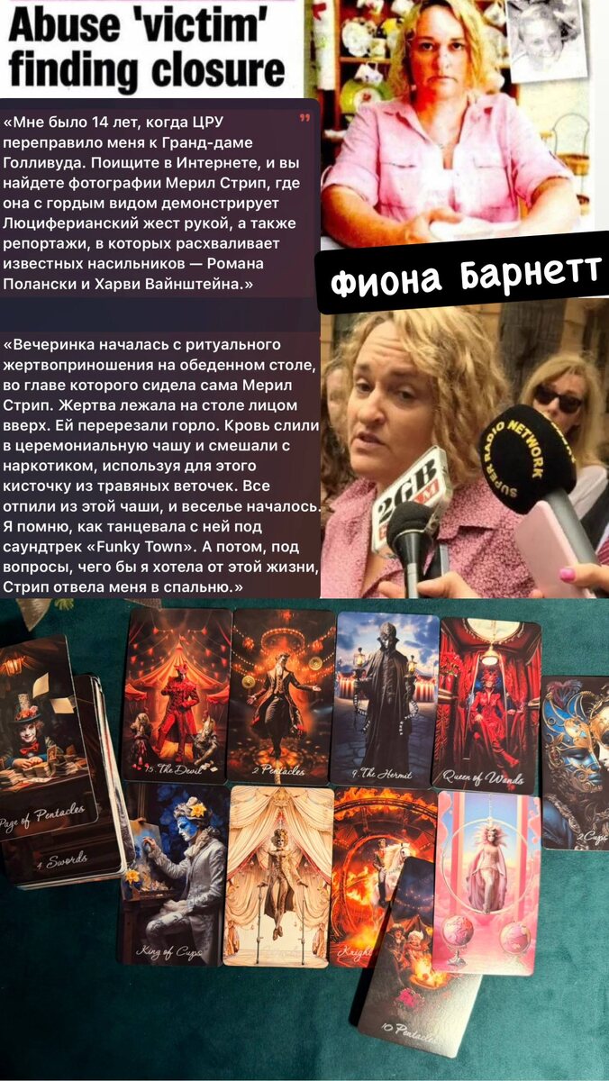 … Люблю Мерил Стрип и знать не знала, что ее некая Фиона Барнетт причисляет к сатанистам. Начнем с самой Фионы ✅ Человек она травмированный с детства (4 мечей, паж пентаклей), склоняюсь к тому, что часть того, что она говорит—правда. По аркану Дьявол проходят всякие ритуальные штуки, но ощущение, что это было больше представление, чем ритуалы (2 пентаклей—50/50) За ширмой этого спектакля озабоченные взрослые дяди и тети использовали детей в незаконных целях, растлевая и уничтожая морально. 🍷Фиона помнит все сквозь призму «измененного сознания»—алкоголь, вещества, поэтому нет ясной картинки, что было на самом деле. Из травмированного ребенка не вырастет здоровый человек, по карте Отшельник, рассказать —способ «переварить» тонну насилия и негатива детства. 🐱Была ли знакома с Мерил Стрип? Да (2 кубков), скорее всего знаменитость посещала подобные «вечеринки» в более молодом возрасте (Королева жезлов), но судя по 2 жезлов играла там далеко не главную РОЛЬ. Не оправдываю ни в коем случ