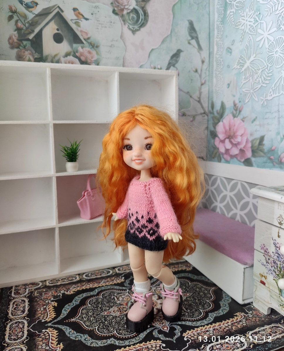 Сегодня мы с девочками покажем наши обновки и немного расскажем про ниточки секционные ( не новые, конечно, но я их приобрела впервые и, возможно кому-то будет интересно) Для тех, кто меня не знает - в основном я занимаюсь изготовление одежды и обуви для разных кукол от 11 до 35см совершенно разных брендов, мои работы можно посмотреть жмем сюда, и всю интересную и полезную информацию выкладываю здесь на канале и у себя в группе ВКонтакте , так что кому интересно - жмем сюда, заказать одежду или обувь на разных кукол можно жмем сюда Начну, пожалуй, со свитерочка, который связала еще пару месяцев назад в период активного увлечения жаккардом, но вот показать так и не получилось, а все потому, что ни один ребенок не захотел его ни то что показать, а даже просто примерить. Даже моя Сонечка уж насколько не привереда и всегда готова на эксперименты и примерки, но даже она нос свой крутила. Кто-то требовал дополнить свитер шапочкой, но на любые предложения только фыркал, кто-то требовал колго