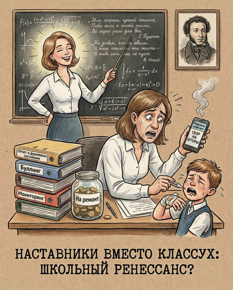 У меня это была женщина-оркестр. Одной рукой она вбивала в нас таблицу Менделеева, другой — разнимала драку за школой, а третьей (фантомной) писала бесконечные отчеты для Районо. В Госдуме решили этот аттракцион невиданной щедрости прекратить. Предлагают ввести должность наставника. Суть проста, как три копейки: Учитель — учит. Наставник — лечит душу. Педагогов хотят полностью освободить от «классного руководства». Больше никаких «сдай на шторы» и «почему Иванов опять без сменки». Теперь специальный человек будет заниматься «мониторингом эмоционального состояния школьников» и «тесным взаимодействием с родителями». В общем, работать психологом, омбудсменом и жилеткой для слёз одновременно. Авторы инициативы верят, что такой подход позволит «своевременно выявлять и предотвращать случаи буллинга». Идея, безусловно, красивая. Главное, чтобы наставник не превратился в очередного завуча с синдромом вахтера. Но давайте верить в лучшее. Вдруг и правда шк