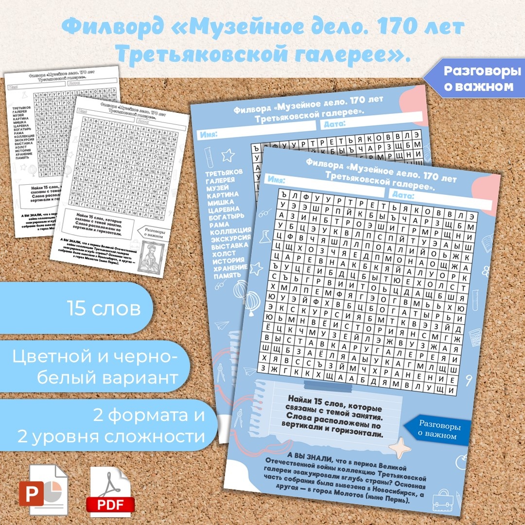 Филворд «Музейное дело. 170 лет Третьяковской галерее» для Разговоров о важном, которые пройдут 19 января. Данный материал можно использовать как дополнительный инструмент на занятиях по внеурочной деятельности. Филворд полезен для развития зрительной памяти и внимания, логического мышления и расширения словарного запаса у ребят. В комплект входит: Готовый филворд к юбилею Третьяковской галереи — это лёгкий способ вовлечь класс в тему. Два уровня сложности помогут учесть разную подготовку детей, а чёрно-белая версия — сэкономить краску. Файл в формате PDF и PPTX на листах А4 и А5. Есть возможность редактирования. Подходит для цветной и черно-белой печати.