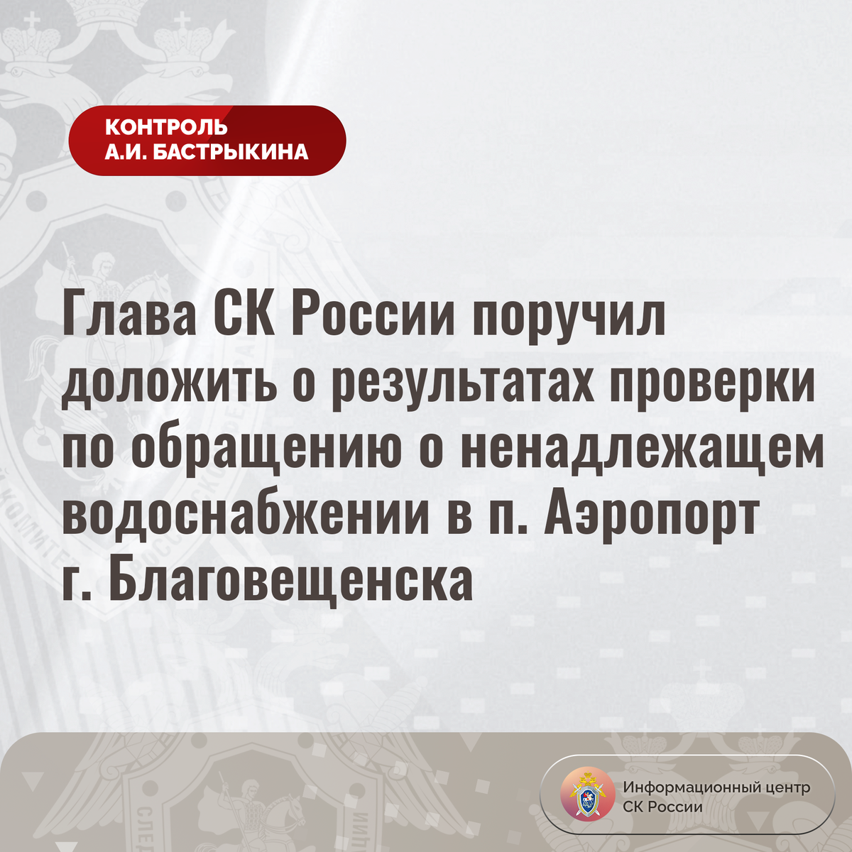 Глава СК России поручил доложить о результатах проверки по обращению о ненадлежащем водоснабжении в п. Аэропорт г. Благовещенска В адрес Председателя СК России А.И. Бастрыкина через его приёмную в социальной сети «ВКонтакте» поступило обращение по вопросу нарушения прав жителей поселка Аэропорта города Благовещенска на качественное водоснабжение. Длительное время жизненно важный коммунальный ресурс поступает в жилые помещения с регулярными перебоями. При этом неоднократно гражданами фиксировалось наличие в воде различных примесей, ввиду чего она была непригодна для питья и бытовых нужд. В настоящее время водоснабжение жителей не осуществляется на протяжении нескольких суток. Профильными структурами подвоз необходимого ресурса надлежащим образом не организован. Обращения в различные инстанции результатов не принесли. Указанная ситуация освещалась в сети Интернет. В СУ СК России по Амурской области организована процессуальная проверка. Председатель Следственного комитета Российской Федер