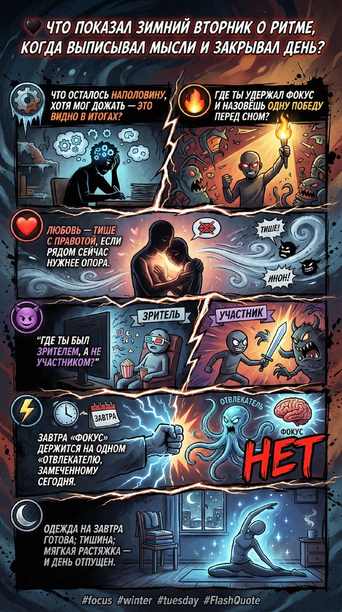 ? ⚙️ Что осталось наполовину, хотя мог дожать — это видно в итогах? 🔥 Где ты удержал фокус и назовёшь одну победу перед сном? ❤️ Любовь — тише с правотой, если рядом сейчас нужнее опора. 😈 "Где ты был зрителем, а не участником?" ⚡ Завтра «Фокус» держится на одном «нет» отвлекателю, замеченному сегодня. 🌙 Одежда на завтра готова; тишина; мягкая растяжка — и день отпущен. #focus #winter #tuesday #FlashQuote