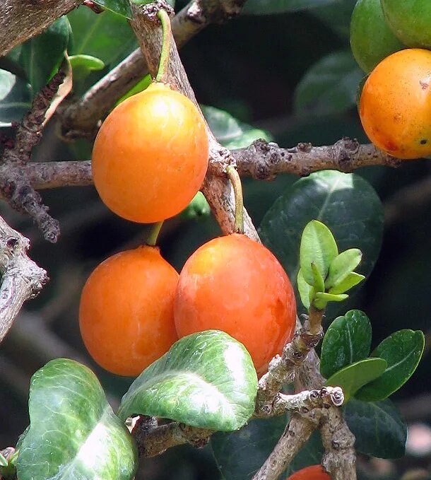 - Плоды: Самая привлекательная часть растения – его плоды. Они округлые или слегка овальные, размером с небольшую сливу или крупную вишню (диаметром 2-4 см). В незрелом виде плоды зеленые, а по мере созревания приобретают яркий оранжево-красный или пурпурный цвет. Кожура тонкая, гладкая. Мякоть сочная, кисло-сладкая, с легкой терпкостью, напоминающая вкус сливы или абрикоса. Внутри плода обычно содержится одно или несколько семян.
