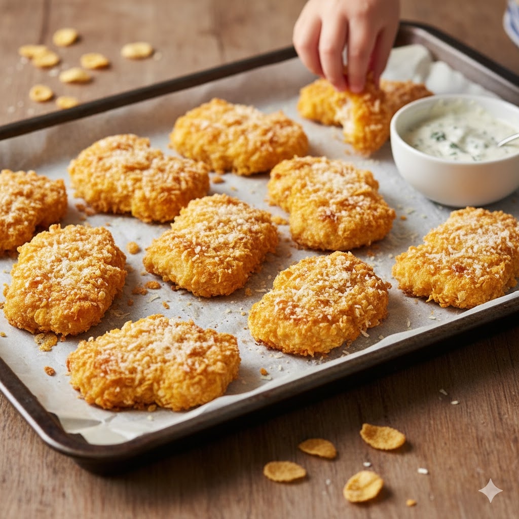 Эти наггетсы получаются невероятно хрустящими снаружи и сочными внутри. Секрет — в маринаде из йогурта и панировке из несладких кукурузных хлопьев. Они намного полезнее жареных, так как запекаются в духовке.