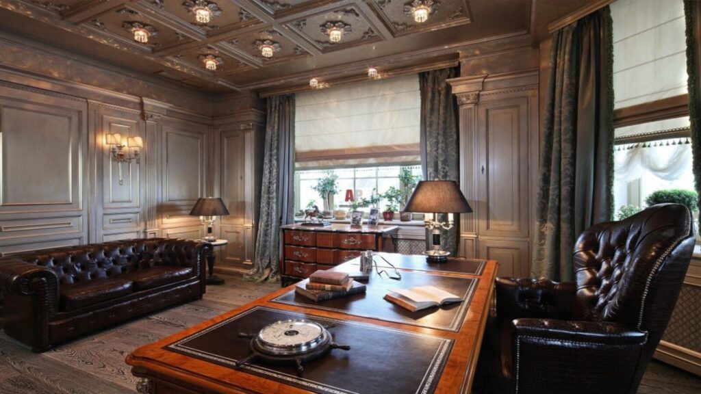 Стены оформляют лепниной, деревянными панелями, обоями с золотым тиснением и сложными орнаментами. Поверхности не остаются «пустыми» — они участвуют в общем декоративном ансамбле.