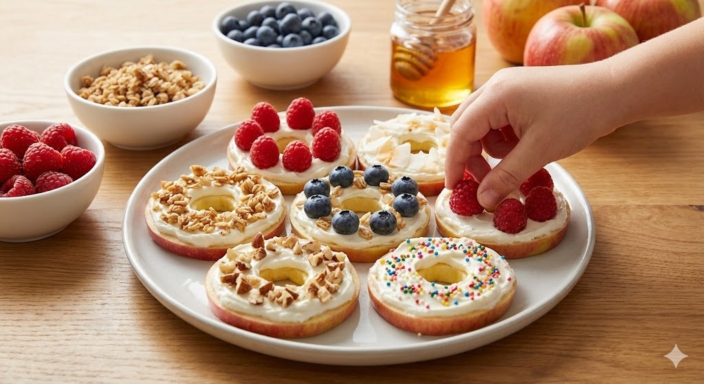Украшение: Предложите ребенку самому украсить свои "пончики" ягодами, гранолой и посыпками. Это превратит полдник в увлекательную игру!