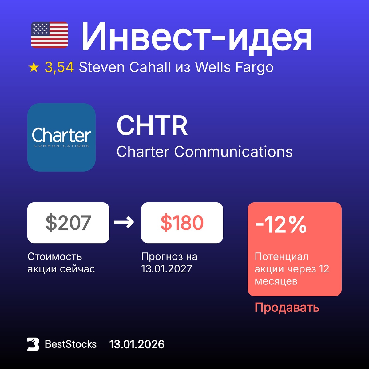 Π’ΠΈΠΊΠ΅Ρ: CHTR ΠΡΠΎΠ³Π½ΠΎΠ·Π½Π°Ρ ΡΠ΅Π½Π°: $180 (-12%) Π Π΅ΠΊΠΎΠΌΠ΅Π½Π΄Π°ΡΠΈΡ: ΠΡΠΎΠ΄Π°Π²Π°ΡΡ InvestRank Π°ΠΊΡΠΈΠΈ: 5 ΠΈΠ· 10 ΠΡΠΎΠ³Π½ΠΎΠ· ΡΠ΄Π΅Π»Π°Π½: 13.01.2026 ΠΡΠΎΠ³Π½ΠΎΠ· Π΄ΠΎ: 13.01.2027 ΠΠ½Π²Π΅ΡΡ-ΠΊΠΎΠΌΠΏΠ°Π½ΠΈΡ: Wells Fargo ΠΠ½Π°Π»ΠΈΡΠΈΠΊ: Steven Cahall ΠΡΡ ΡΠ΅ΠΊΠΎΠΌΠ΅Π½Π΄Π°ΡΠΈΠΈ Π½Π° ΡΠ΅Π³ΠΎΠ΄Π½Ρ β β’β’β’β’β’ β‘οΈ ΠΠΎΠ²ΡΠΉ ΡΡΠ½ΠΊΡΠΈΠΎΠ½Π°Π» Π½Π° ΡΠ°ΠΉΡΠ΅ β π·πΊ ΠΠ°ΠΊΠΈΠ΅ ΡΡΡΡΠΊΠΈΠ΅ Π°ΠΊΡΠΈΠΈ Π² ΡΡΠ΅Π½Π΄Π΅. Π£Π·Π½Π°ΠΉΡΠ΅, ΠΊΠ°ΠΊΠΈΠ΅ Π±ΡΠΌΠ°Π³ΠΈ ΠΈΠ· Π ΠΎΡΡΠΈΠΈ ΠΏΠΎΠ»ΡΡΠΈΠ»ΠΈ Π±ΠΎΠ»ΡΡΠ΅ Π²ΡΠ΅Π³ΠΎ ΡΠ΅ΠΊΠΎΠΌΠ΅Π½Π΄Π°ΡΠΈΠΉ Π·Π° ΠΏΠΎΡΠ»Π΅Π΄Π½ΡΡ Π½Π΅Π΄Π΅Π»Ρ.