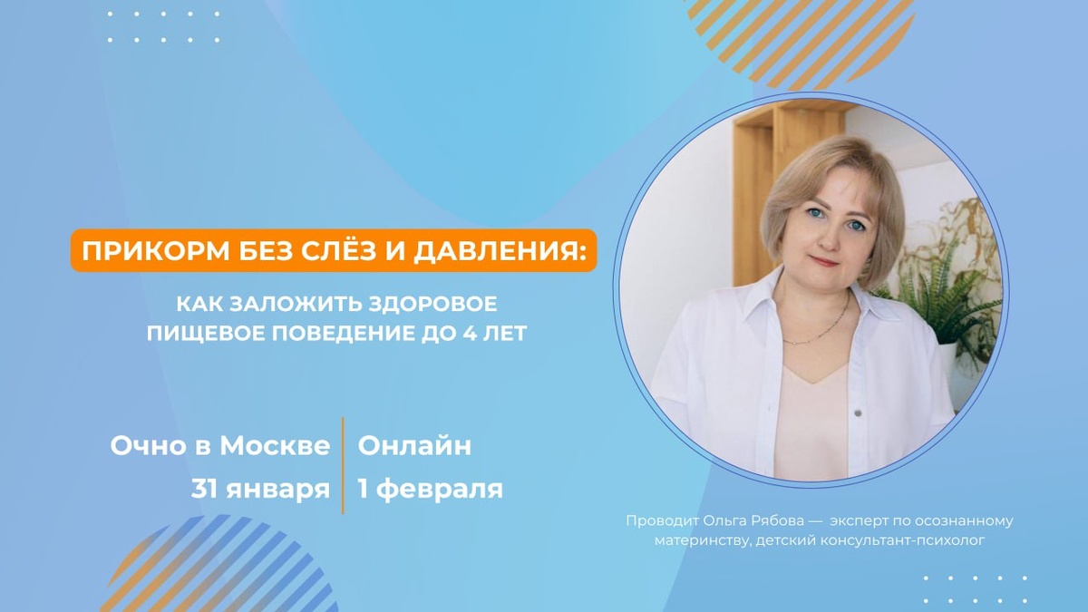 ! Мастер-класс для мам о прикорме без слёз, давления и чувства вины и о том, как заложить здоровое пищевое поведение ребёнка до 4 лет. 🤍 👉🏻 МОСКВА / ОНЛАЙН 👈🏻 Этот мастер-класс подойдёт вам, если: — вы только готовитесь к прикорму и хотите сразу выстроить всё спокойно и правильно; — прикорм уже есть, но за столом появляются уговоры, мультики и напряжение; — вы устали переживать: «Он мало ест», «Я делаю что-то не так». Чаще всего проблема не в еде. А в том, как устроен прикорм и какую роль в нём берёт на себя мама. Что разберём: ❓почему прикорм так часто становится источником стресса; ❓какие ошибки забирают у мамы энергию и уверенность; ❓как давление (даже незаметное) влияет на аппетит ребёнка; ❓что делать, если прикорм уже начался с трудностями; ❓как заложить здоровые отношения с едой на годы вперёд. Вы уйдёте с понятным планом действий под вашу ситуацию!💯 ФОРМАТЫ УЧАСТИЯ: ✅Оффлайн (Москва) — 31 января, с 14:00! Живая камерная встреча. Будут разборы кейсов от Ольги, возмож